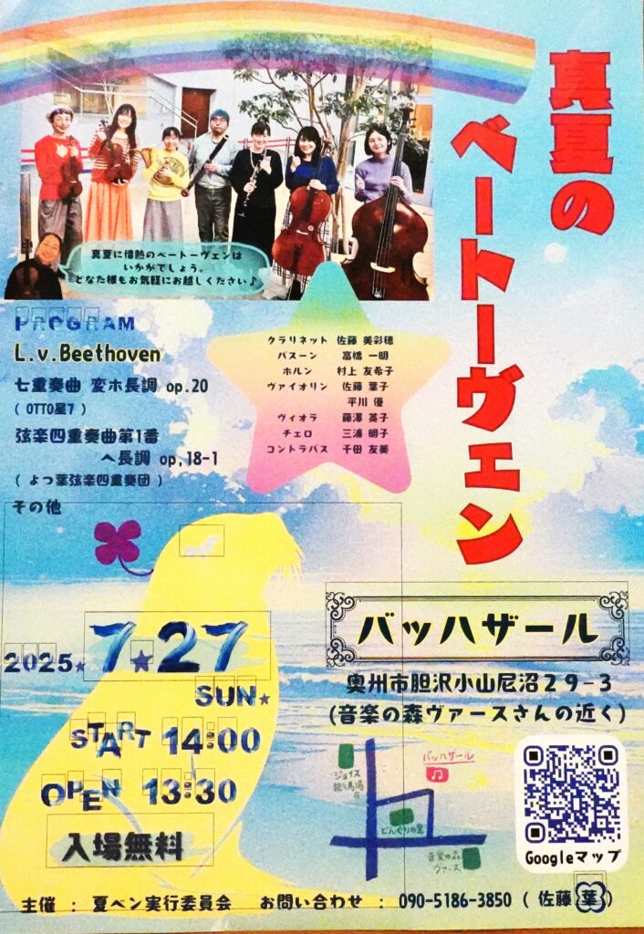 7月27日 奥州市にある小さな小さなライブホール・バッハザールにおいて行われたミニコンサートに行ってきました。会場は民家を改造して作られた素敵なホール「バッハザール」。大きな窓の外には小鳥が遊ぶ林が小川のそばに鬱蒼と茂っています。窓の外を眺めているだけで、さっきまでの汗がウソのようにスーッと引いていく気がします。ここでおこなわれたのがベートーヴェンの「七重奏曲 変ホ長調 op.20」 と、「弦楽四重奏曲第1番 ヘ長調 op.18-1.」
