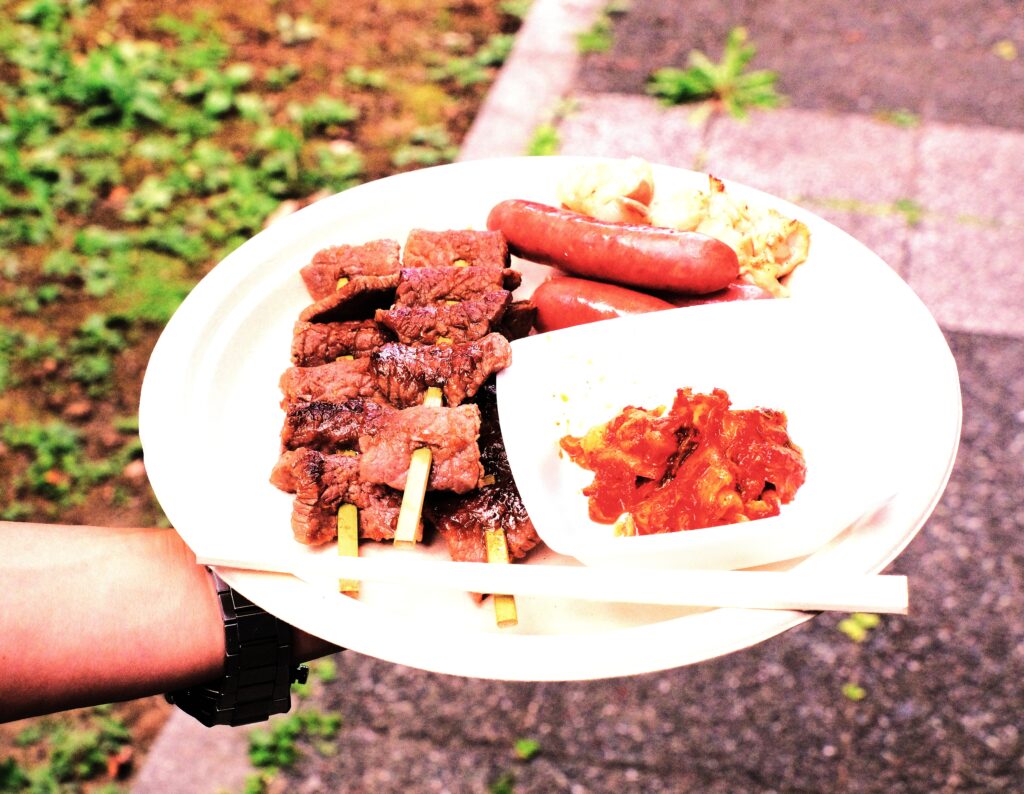 1階のひろばで焼き肉プレートのサービスをいただきました。牛肉の串焼きにソーセージ、新鮮なもつ焼きにキムチまで付いています。