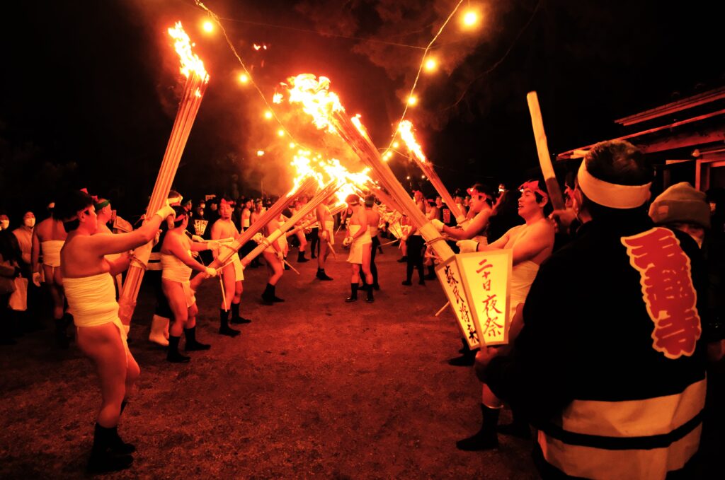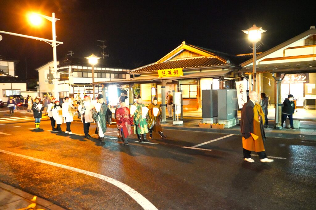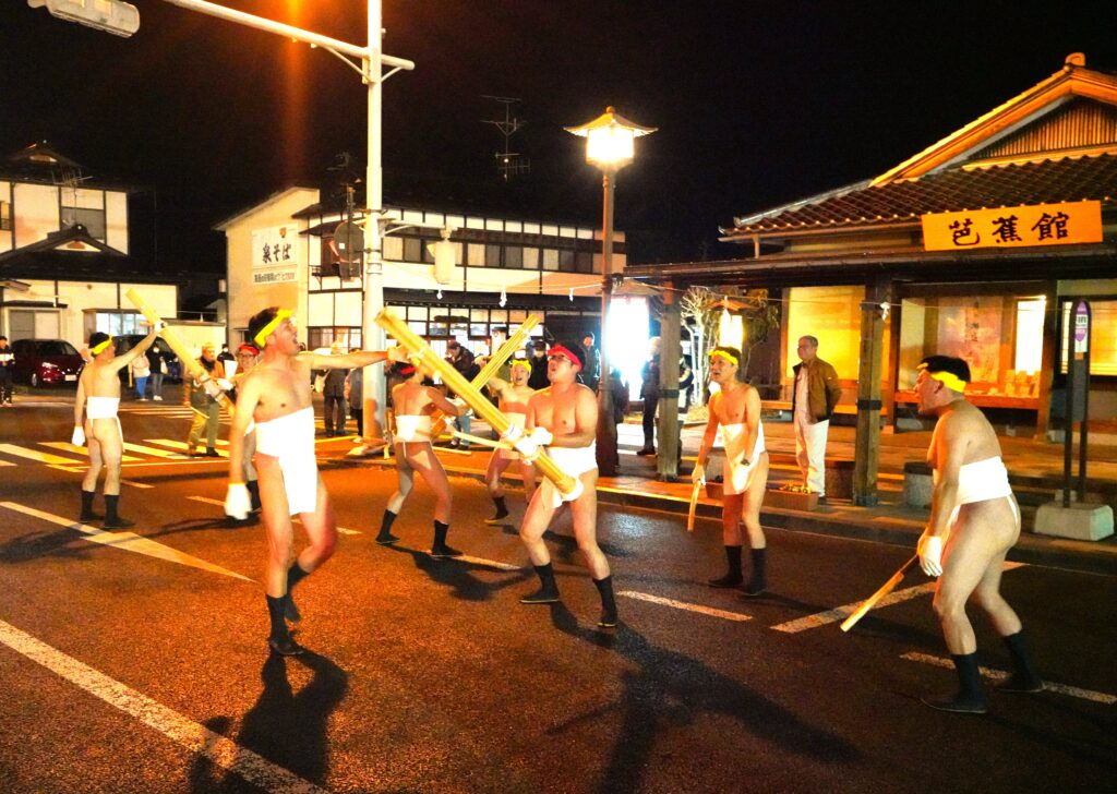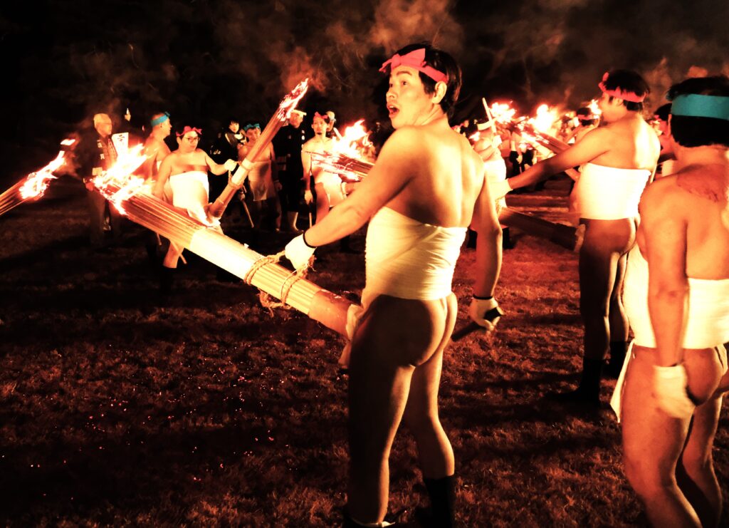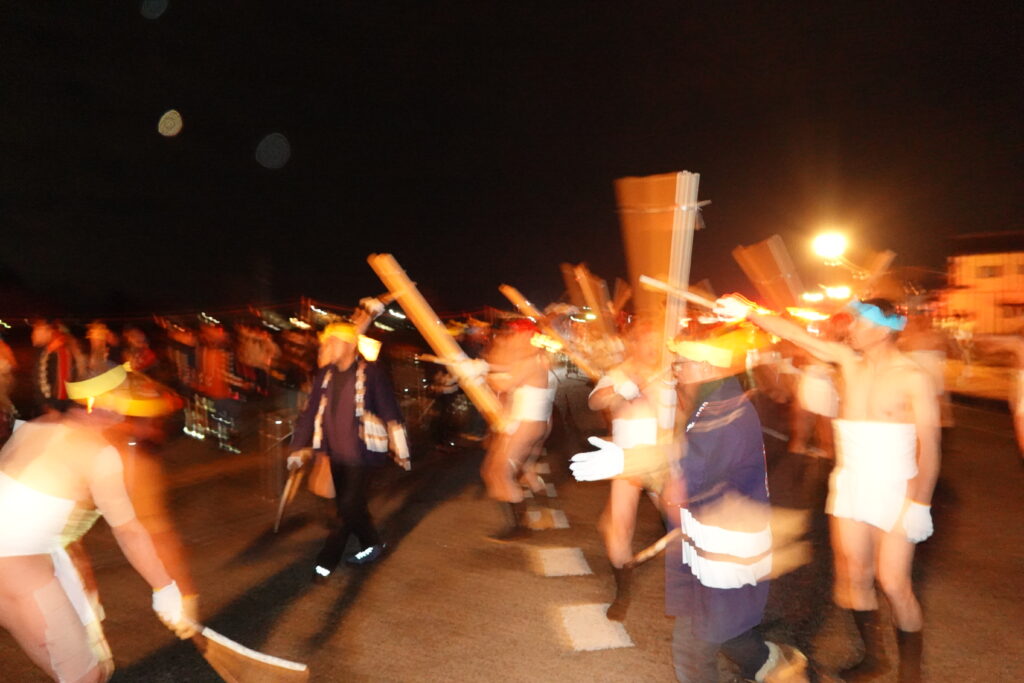 毛越寺通りを松明を掲げながら、音頭をとる男衆の声に合わせて大きな掛け声を出す年男たち